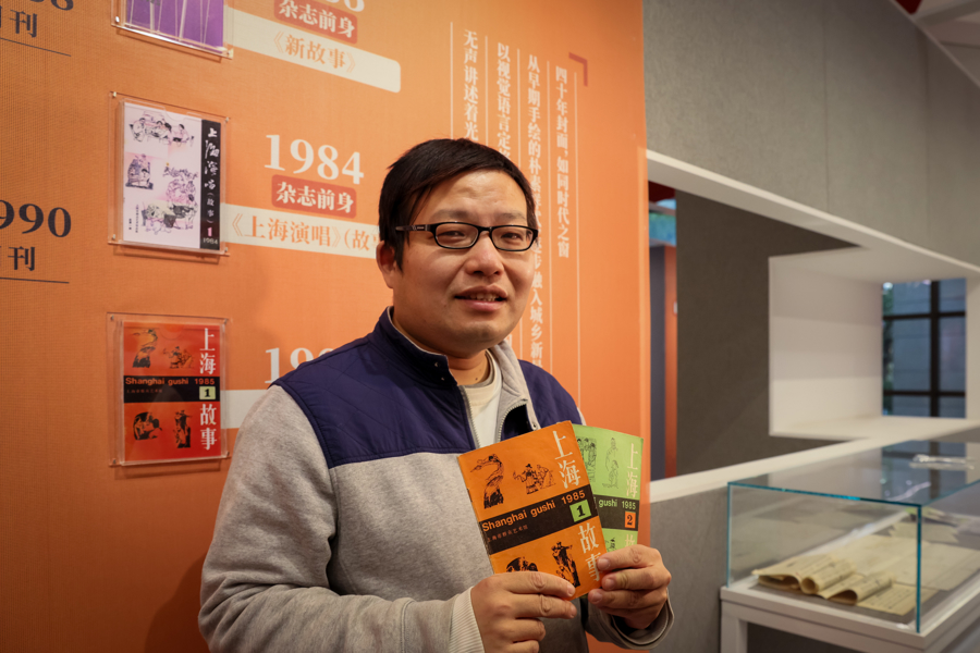 展览现场,读者孔祥斌向记者展示他收藏的《上海故事》创刊号。