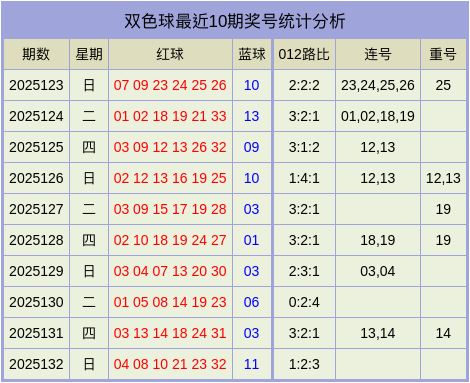 最近10期奖号数据统计表